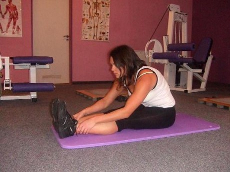 cvičení s trenérem - protažení bederních vzpřimovačů v případě co nejvíce podsazené pánve, při rovném předklonu včetně překlápění pánve vpřed protažení zadní strany stehen